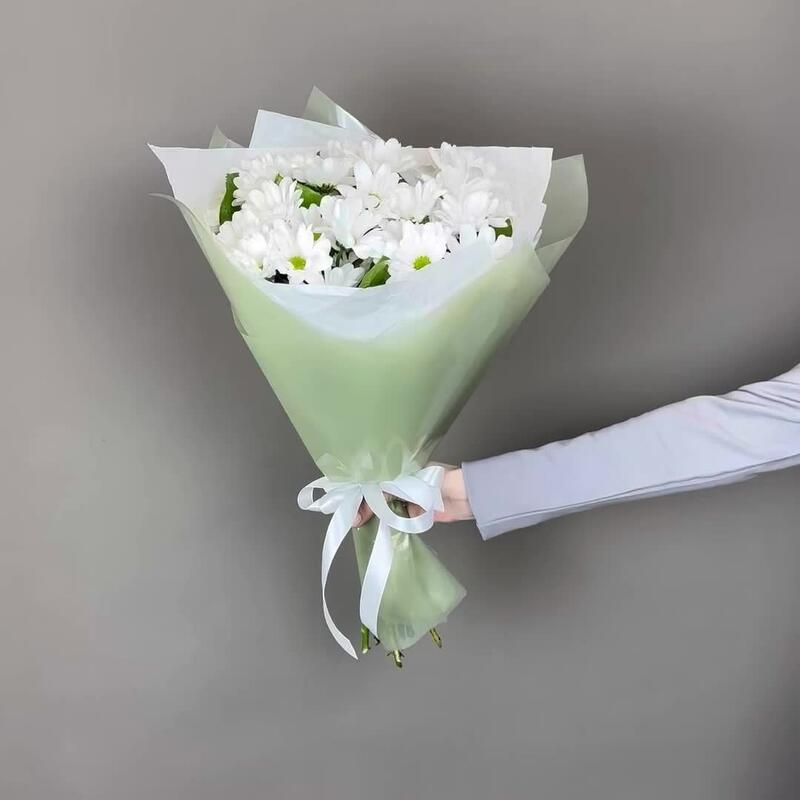 Фисташка – 3 шт.Лента атласная – 1 шт.Упаковка дизайнерская – 1 шт.Хризантема Кустовая Бакарди белая – 5 шт.Тишью белое – 1 шт.
