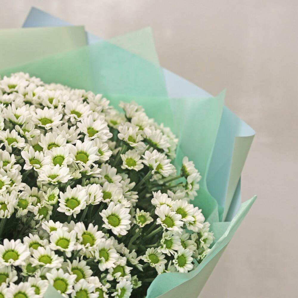 Букет из 25 белых кустовых хризантем Сантини в стильной упаковке