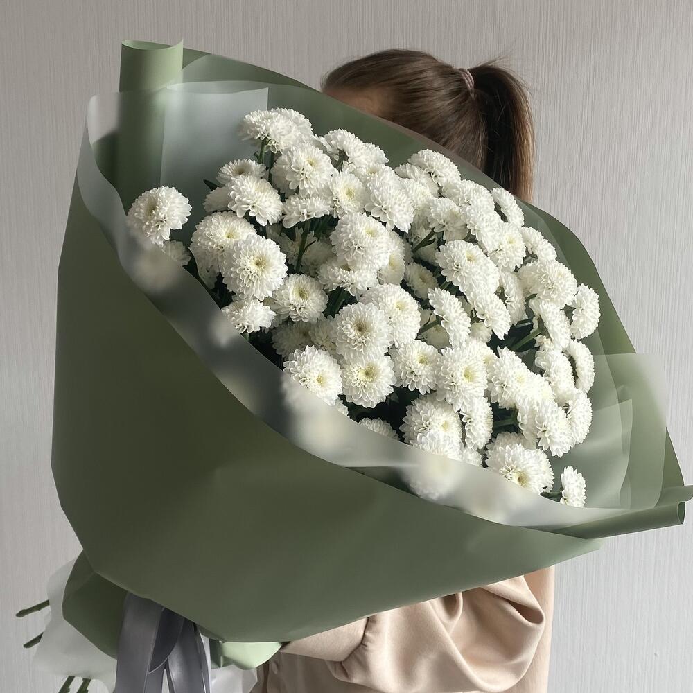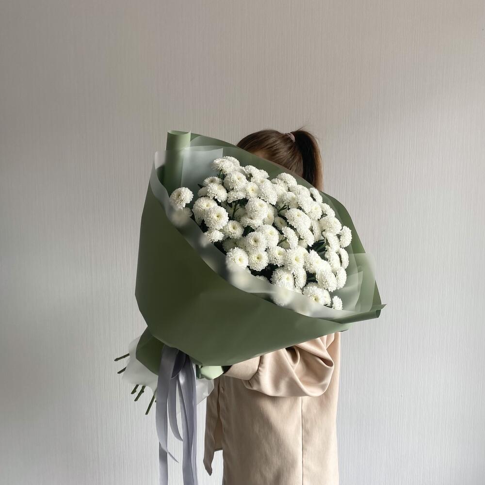 Букет из хризантем в эвкалиптовой упаковке