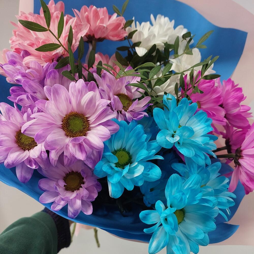 Лента – 1 шт.Хризантема кустовая – 5 шт.Упаковка дизайнерская – 2 шт.Бумага тишью – 1 шт.фисташка зелень – 1 шт.