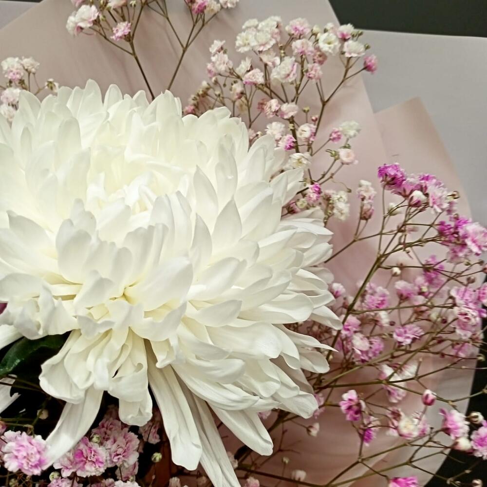 Гипсофила – 2 шт.Хризантема – 1 шт.Упаковка дизайнерская – 1 шт.