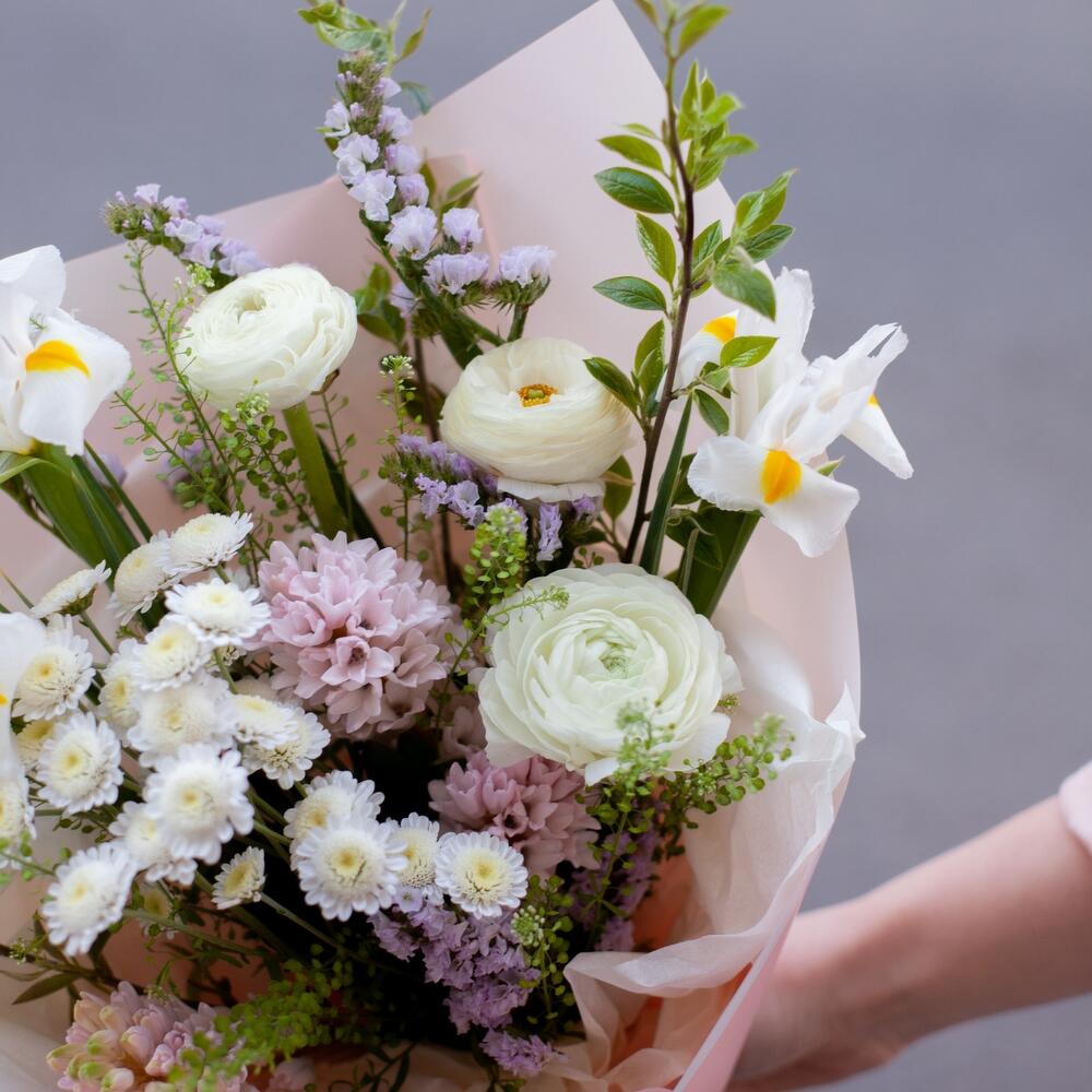 Гиацинт – 3 шт.Ирис – 3 шт.Хризантема кустовая – 2 шт.Ранункулюс – 3 шт.Статица – 3 шт.зелень декоративная – 5 шт.Дизайнерская упаковка – 1 шт.