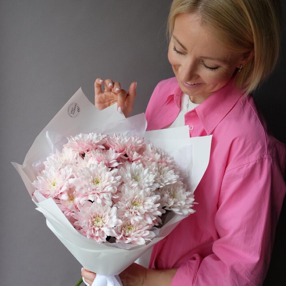 Хризантема кустовая – 5 шт.Тишью – 1 шт.Упаковка дизайнерская – 1 шт.Открыточка с вашими пожеланиями – 1 шт.