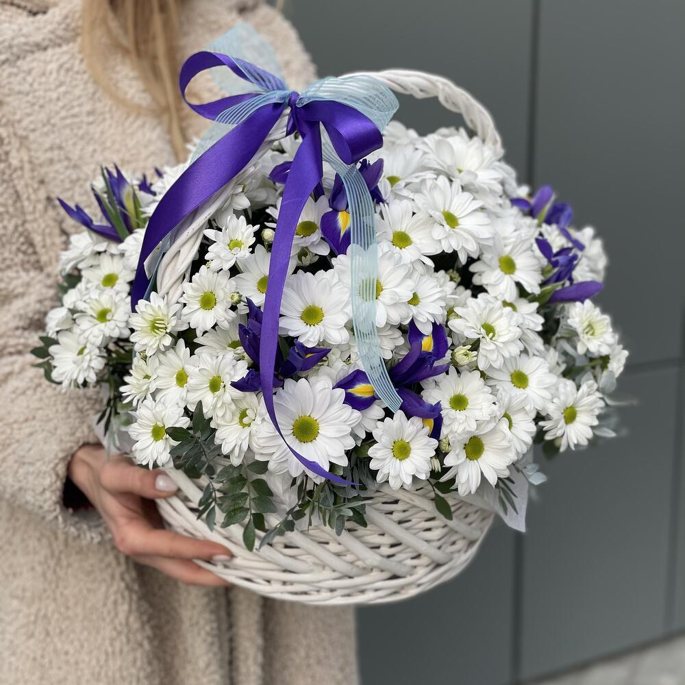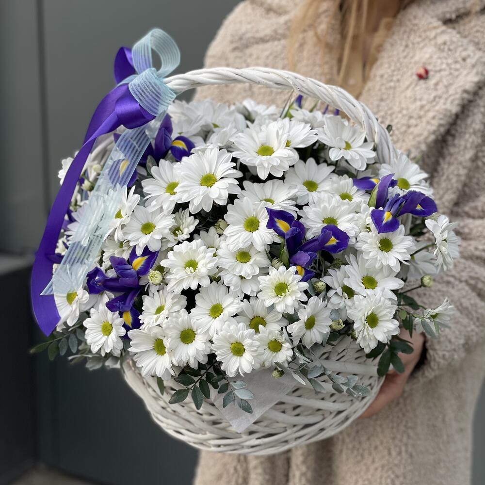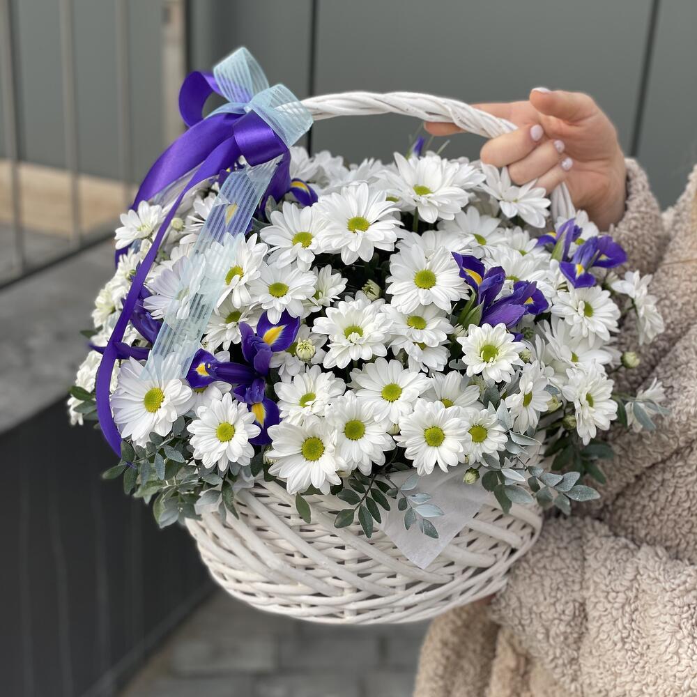 Корзина с белой ромашковой хризантемой и ирисами!