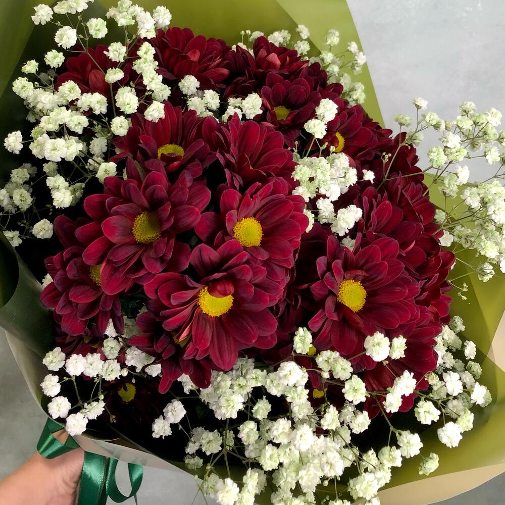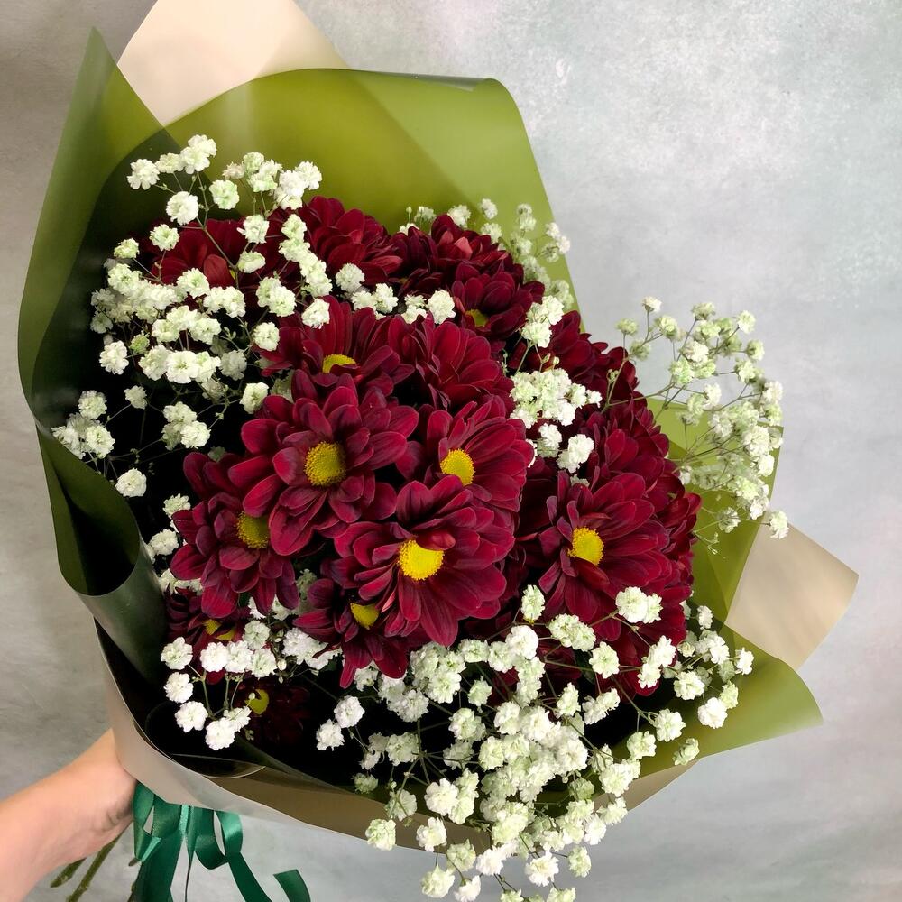 Хризантема кустовая красная – 5 шт.гипсофила радужная – 3 шт.Упаковка дизайнерская – 2 шт.