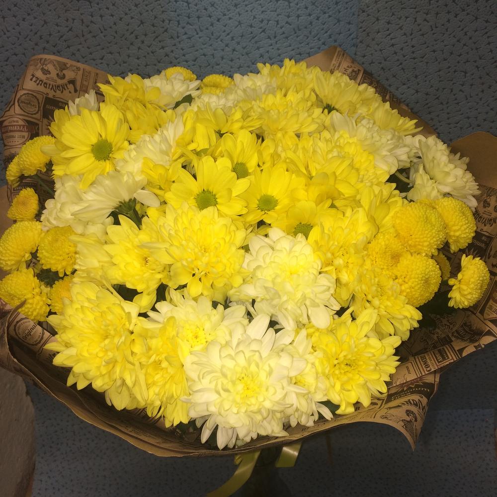 Хризантема кустовая – 17 шт.Рускус сочи – 7 шт.Упаковка крафт – 1 шт.