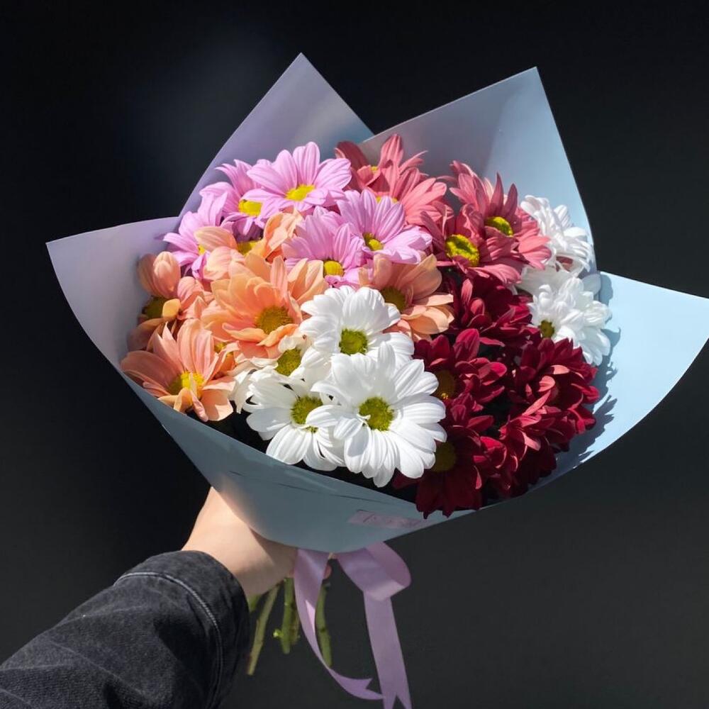 Хризантема кустовая – 7 шт. Упаковка дизайнерская – 2 шт. Открыточка с вашими пожеланиями – 1 шт.