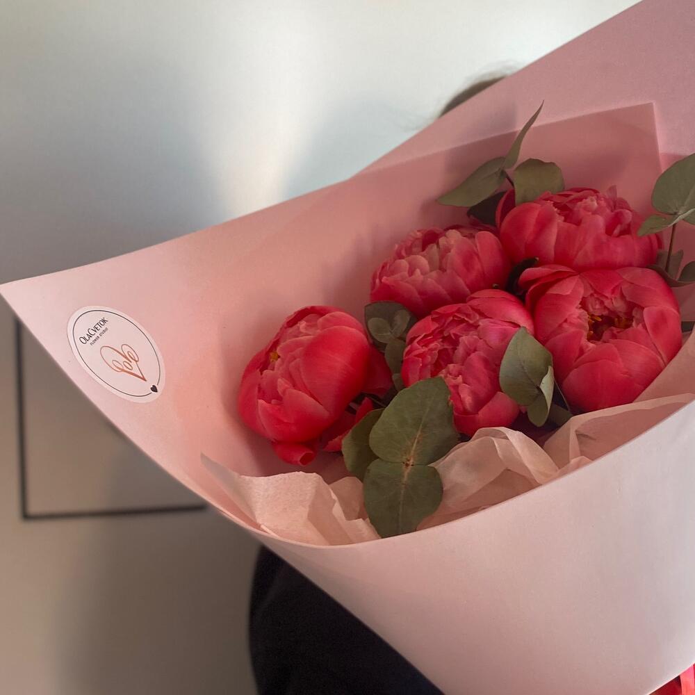 Пион Коралл Шарм (Coral Charm) – 5 шт.Эвкалипт – 5 шт.фоамтран – 2 шт.Лента атласная – 2 шт.Тишью – 2 шт.инструкция по уходу за цветами – 1 шт.хризал – 1 шт.