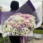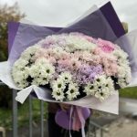 Пионовидные розы с кустовыми хризантемами в букете