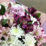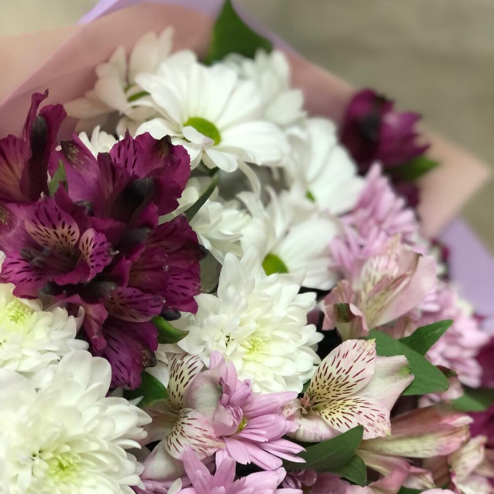 Альстромерия – 6 шт.Хризантема кустовая – 5 шт.Упаковка дизайнерская – 2 шт.Рускус – 5 шт.Лента атласная – 2 шт.