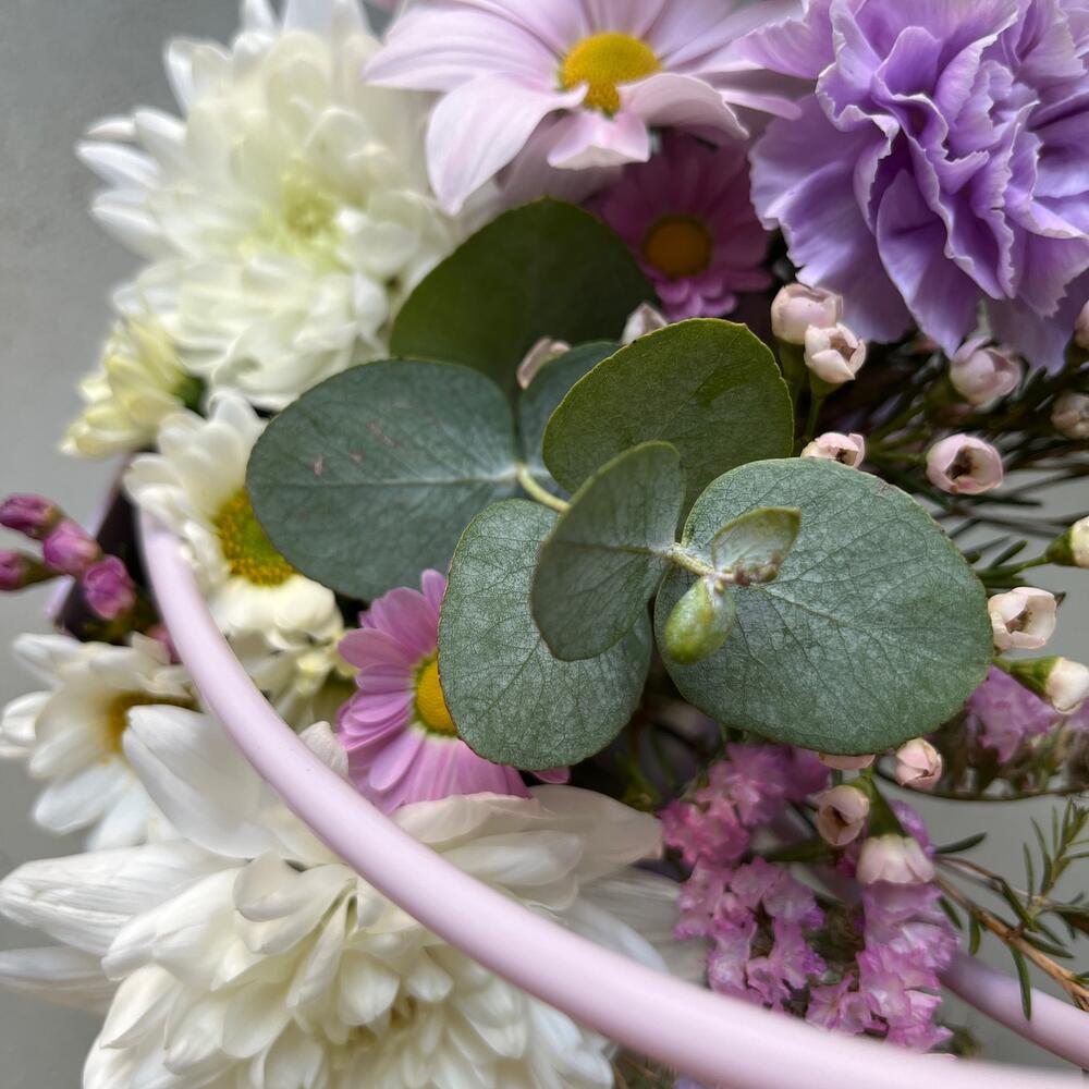 Шляпная коробка фиолетовых гвоздик (N 130)