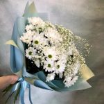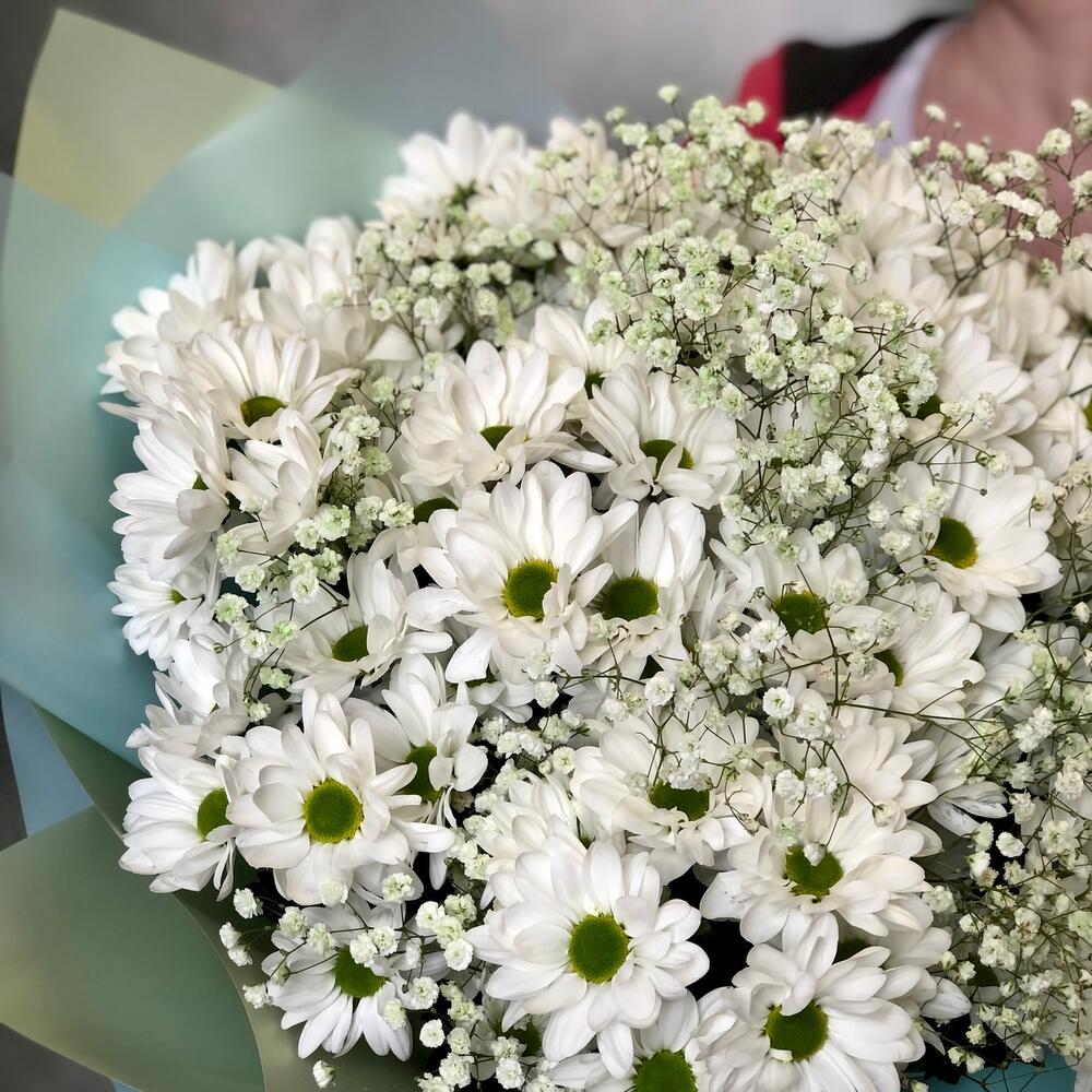 Хризантема кустовая – 13 шт.Гипсофила – 5 шт.Упаковка дизайнерская – 2 шт.