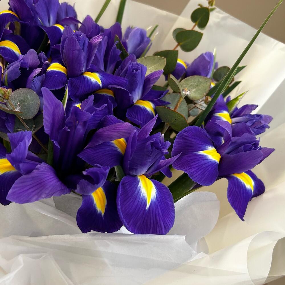 Ирис – 15 шт.Эвкалипт – 2 шт.Лента атласная – 1 шт.Упаковка дизайнерская – 2 шт.