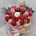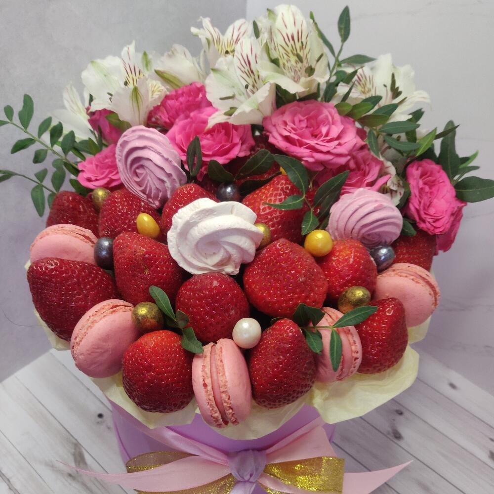 Альстромерия – 2 шт.Клубника – 500 гр.Кустовая роза – 3 шт.Шляпная коробка – 1 шт.маккаруны – 5 шт.Меренга (безе) ручной работы – 3 шт.