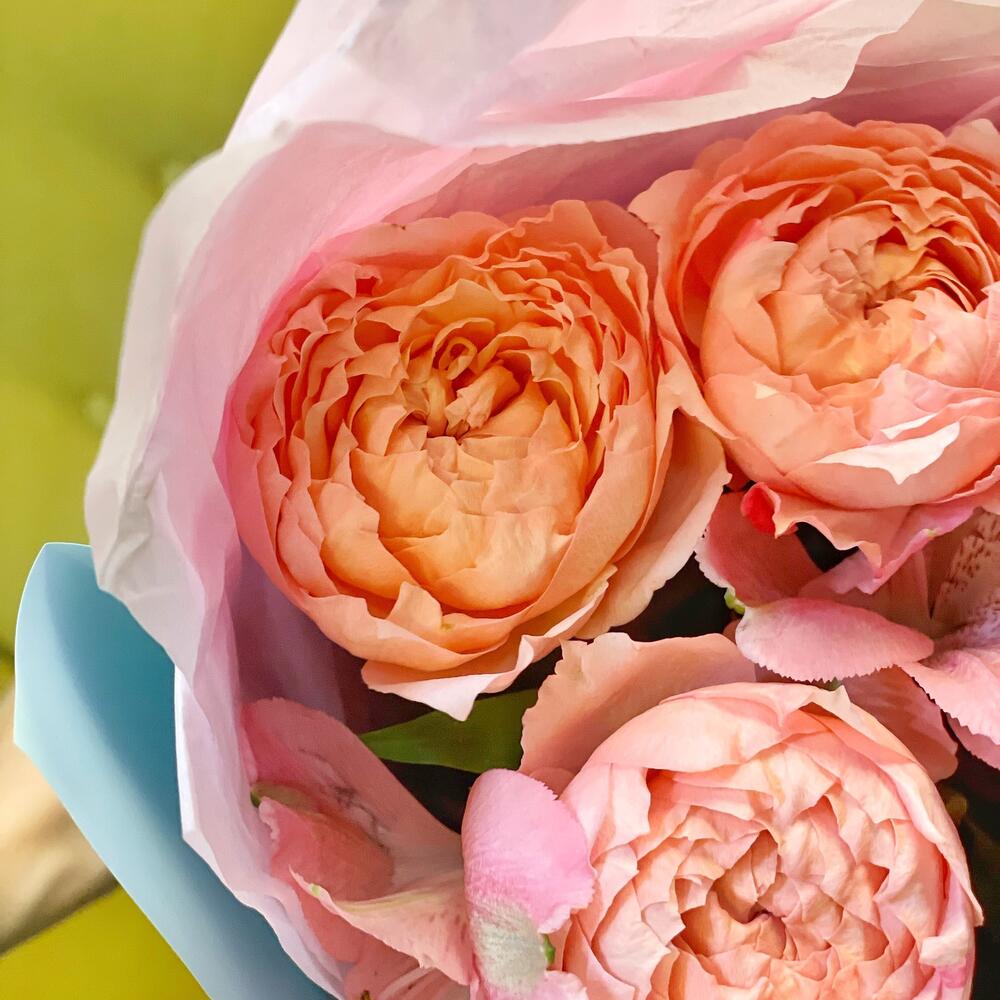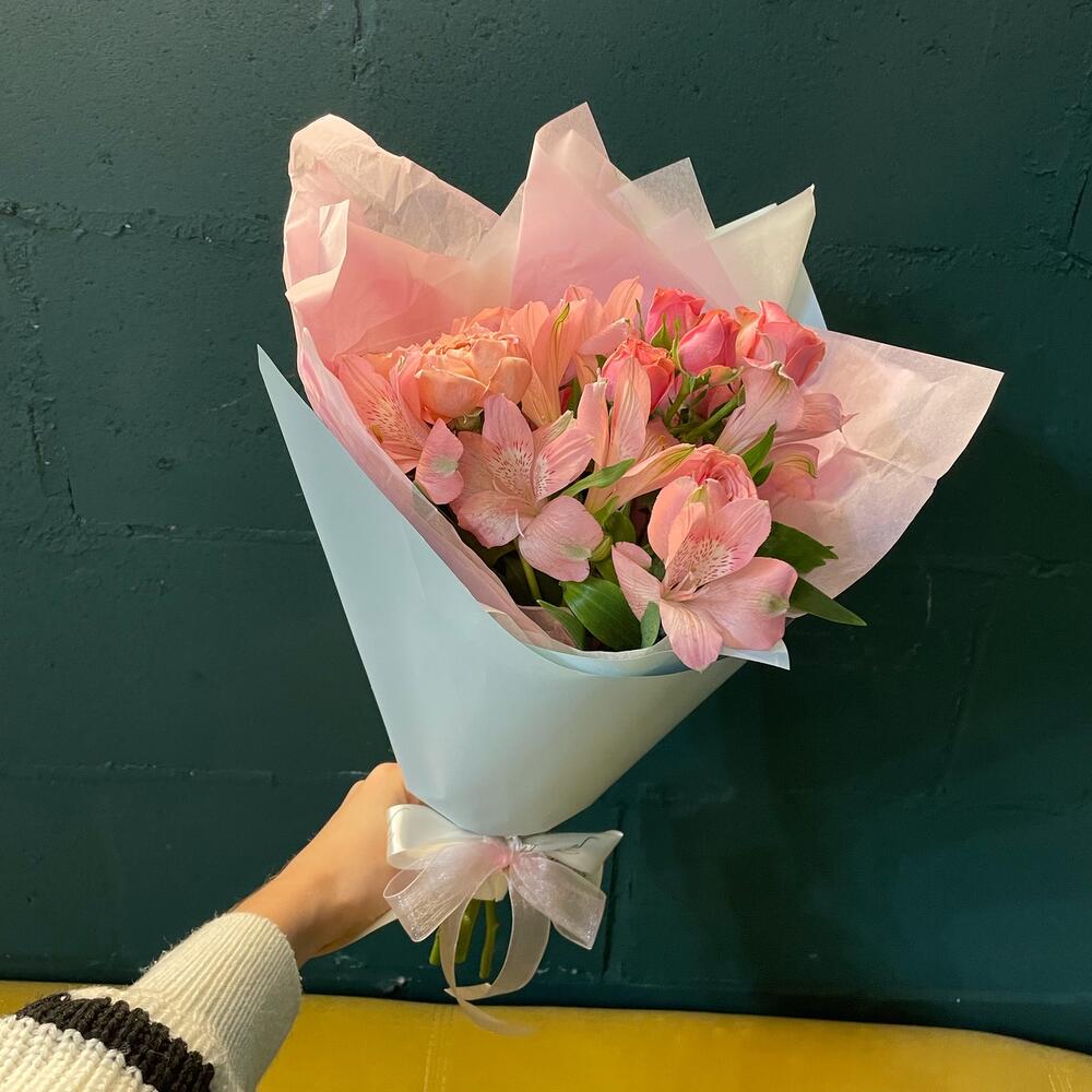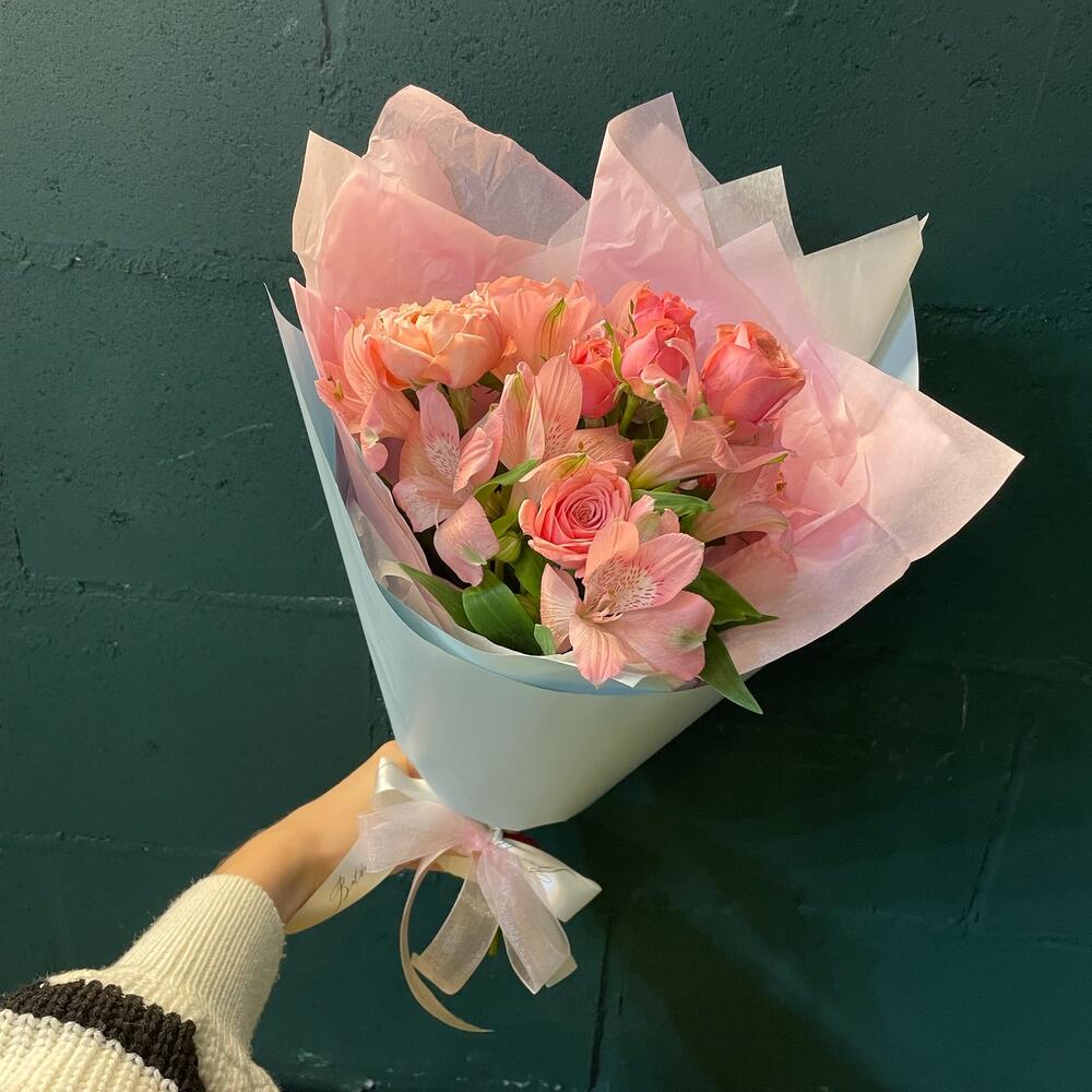 Роза кустовая пионовидная – 1 шт.Роза кустовая – 1 шт.Альстромерия – 1 шт.Упаковка дизайнерская – 1 шт.