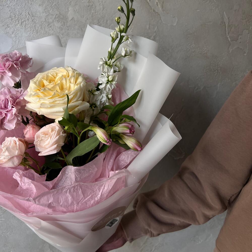 Нежный букет комплимент с маттиолой и пионовидной розой