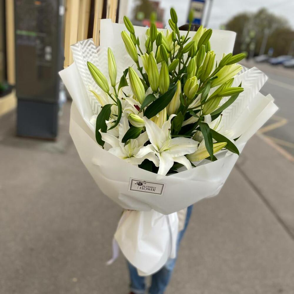 Букет из 9 белых лилий в дизайнерской упаковке "Ливерпуль"