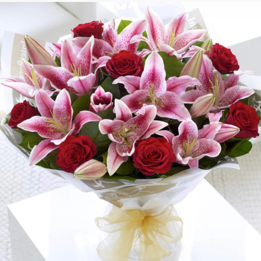 лилии – 8 шт.розы – 7 шт.дизайнерская упаковка и атласная лента – 1 шт.