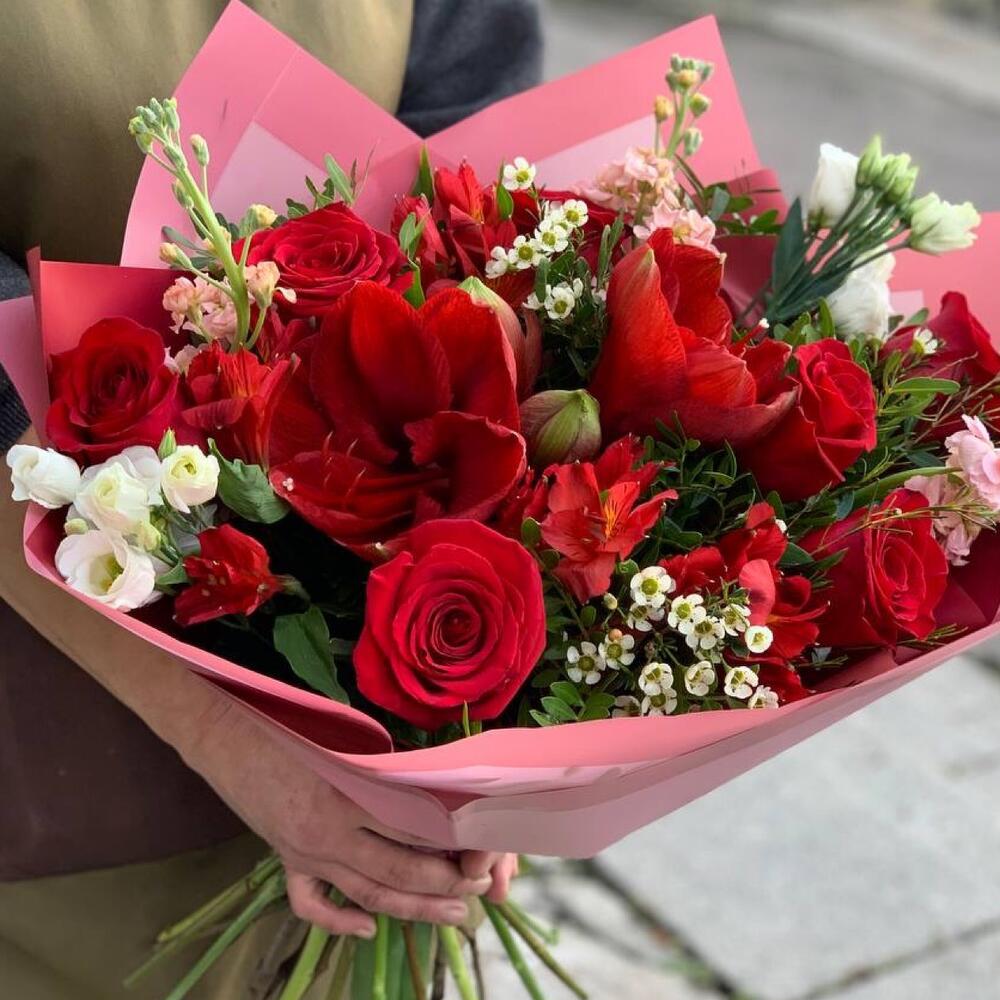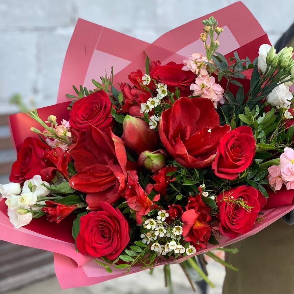 Амариллис – 1 шт.Роза Эквадор – 7 шт.Лизиантус – 2 шт.Маттиола – 3 шт.Фисташка – 3 шт.Ваксфлауэр – 2 шт.Альстромерия – 3 шт.Упаковка дизайнерская – 2 шт.
