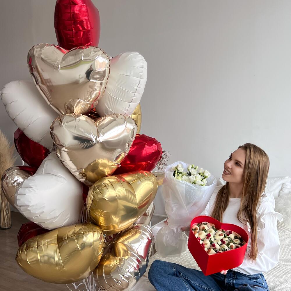 Состав:— Большая связка фольгированных шаров сердец – 20шт.— Букет из 5 веточек белой эустомы— Клубничный набор “Сердце”, большоеВ состав набора входит:- 7 ягод в белом бельгийском шоколаде Callebaut, декор: миндаль цельный- 8 ягод в белом бельгийском шоколаде Callebaut, декор: цельная сублимированная малина- 7 ягод в белом бельгийском шоколаде Callebaut, декор: золотой кандуринПримечание:— Клубничный набор имеет прозрачную крышку и перевязан атласной лентой с бантом.— Размеры упаковки 21*22 см.— Натуральный продукт. Срок годности клубники в шоколаде до 24 часов. Храните ягоду в холодильнике при температуре +4..+8 градусов.