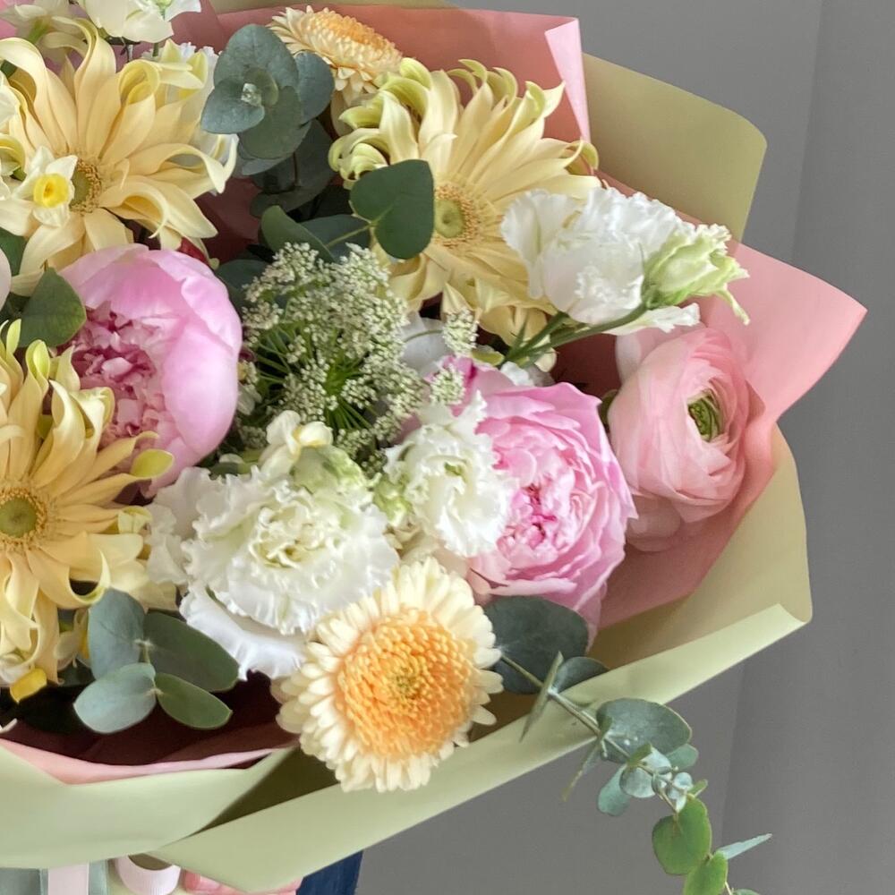 Пион – 3 шт.Ранункулюс – 3 шт.гербера кучерявая – 3 шт.Амми – 3 шт.Лизиантус – 3 шт.Нарцисс – 3 шт.Гербера мини – 3 шт.Эвкалипт – 6 шт.Упаковка – 1 шт.