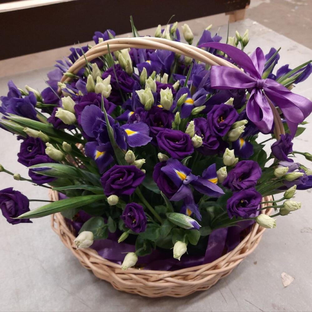 Лизиантус – 9 шт.Лента атласная – 1 шт.Корзина плетеная – 1 шт.Ирис Blue Magic – 30 шт.Оазис флористический – 3 шт.