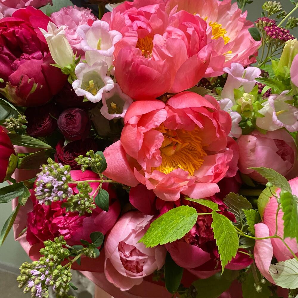 Лизиантус – 3 шт.Пион – 13 шт.Эвкалипт – 5 шт.Упаковка – 1 шт.Малина – 3 шт.Львиный зев – 3 шт.Травы – 7 шт.Колокольчик – 2 шт.