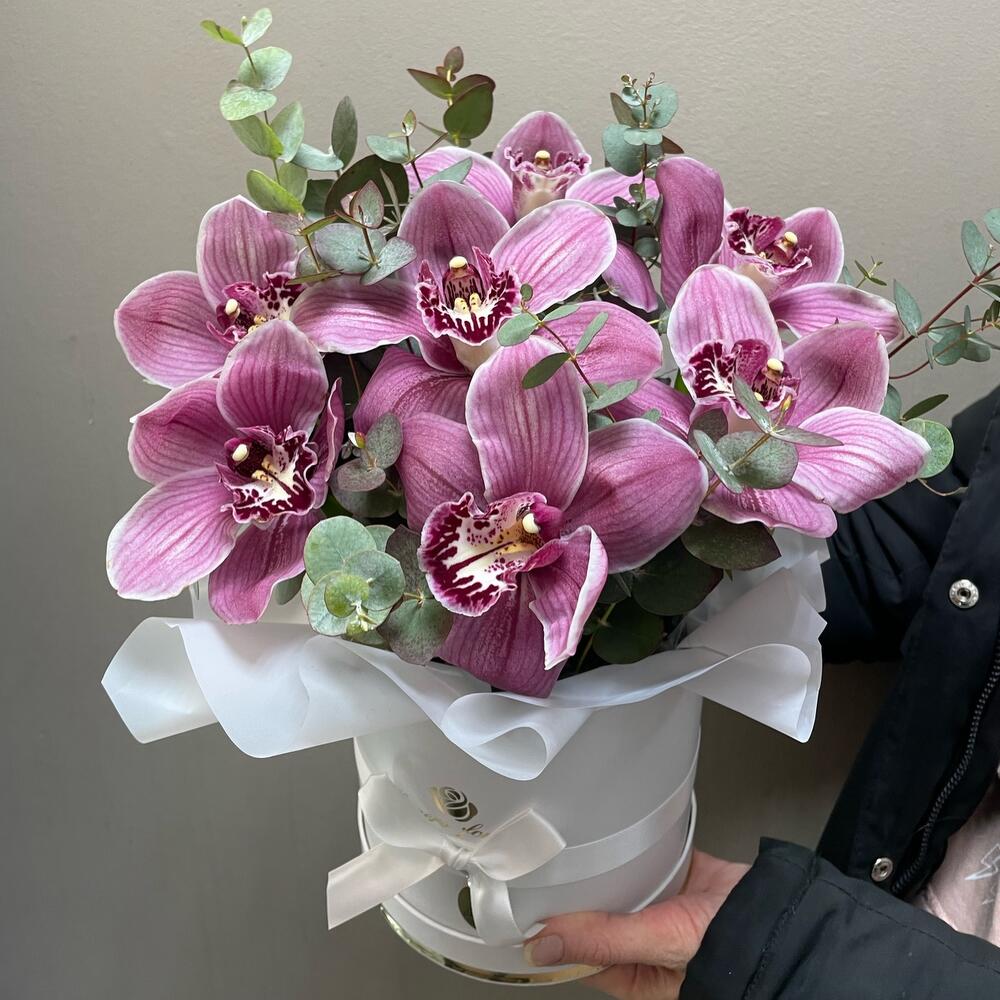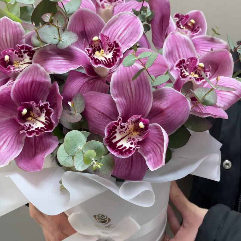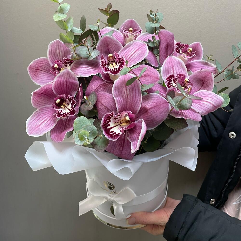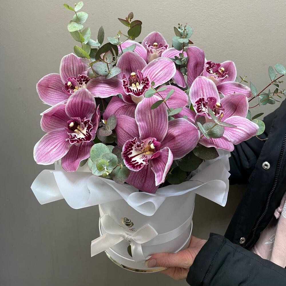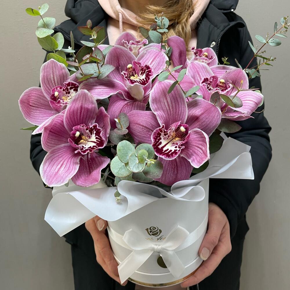 Орхидея Цимбидиум – 7 шт.Эвкалипт – 2 шт.Коробка шляпная – 1 шт.Оазис флористический – 1 шт.