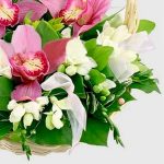 Нежная, трогательная композиция из орхидей цимбидиум и белоснежных фрезий в корзинке. Ансамбль дополнен зеленью и декоративными элементами из лент и бусин. Для самых очаровательных принцесс! Аромат фрезий настолько притягателен, что получательниц не захочет выпускать такую корзинку из рук 🙂 Подарите кучу позитивных эмоций дорогому человеку!