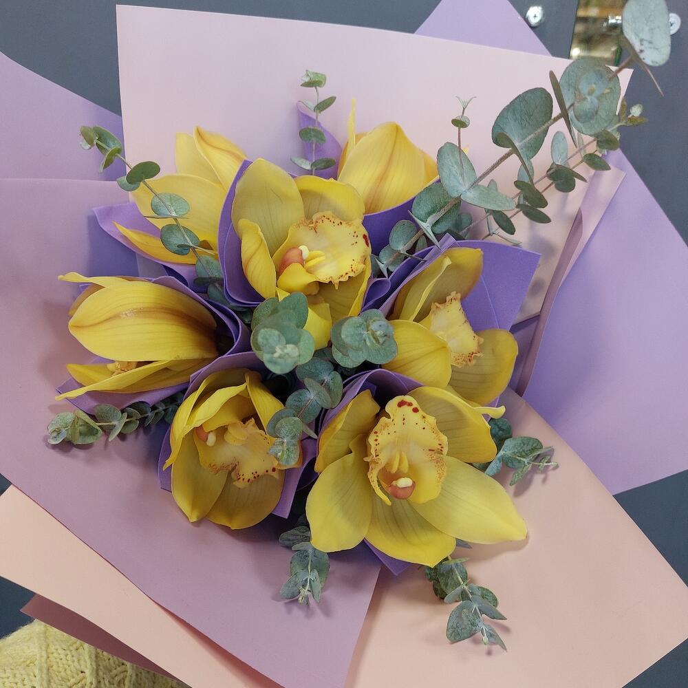 Орхидея Цимбидиум – 7 шт.Эвкалипт – 5 шт.Упаковка дизайнерская – 3 шт.Лента атласная – 2 шт.