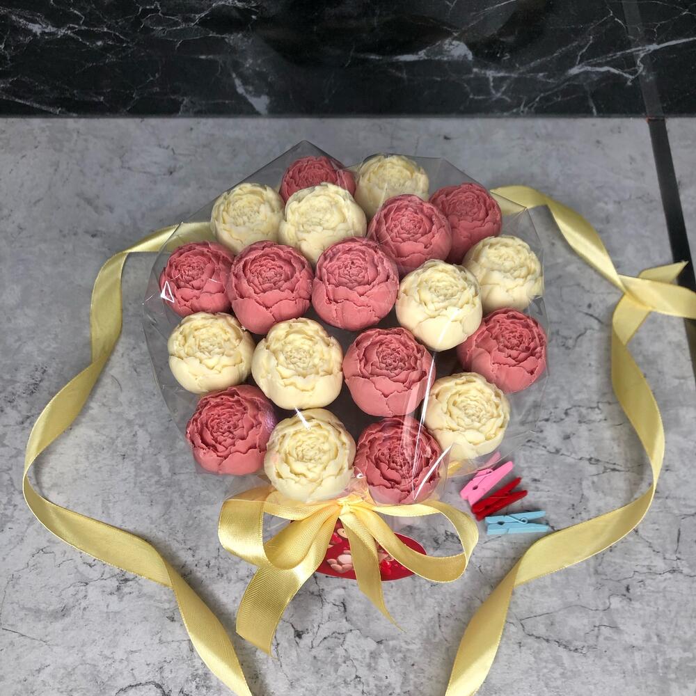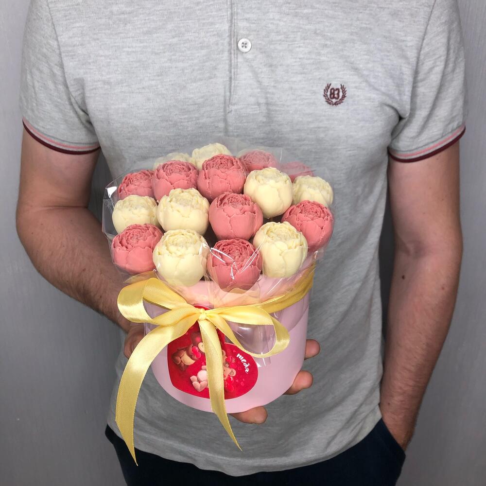 Мини открытка – 1 шт.шоколадные пионы из бельгийского шоколада – 19 шт.