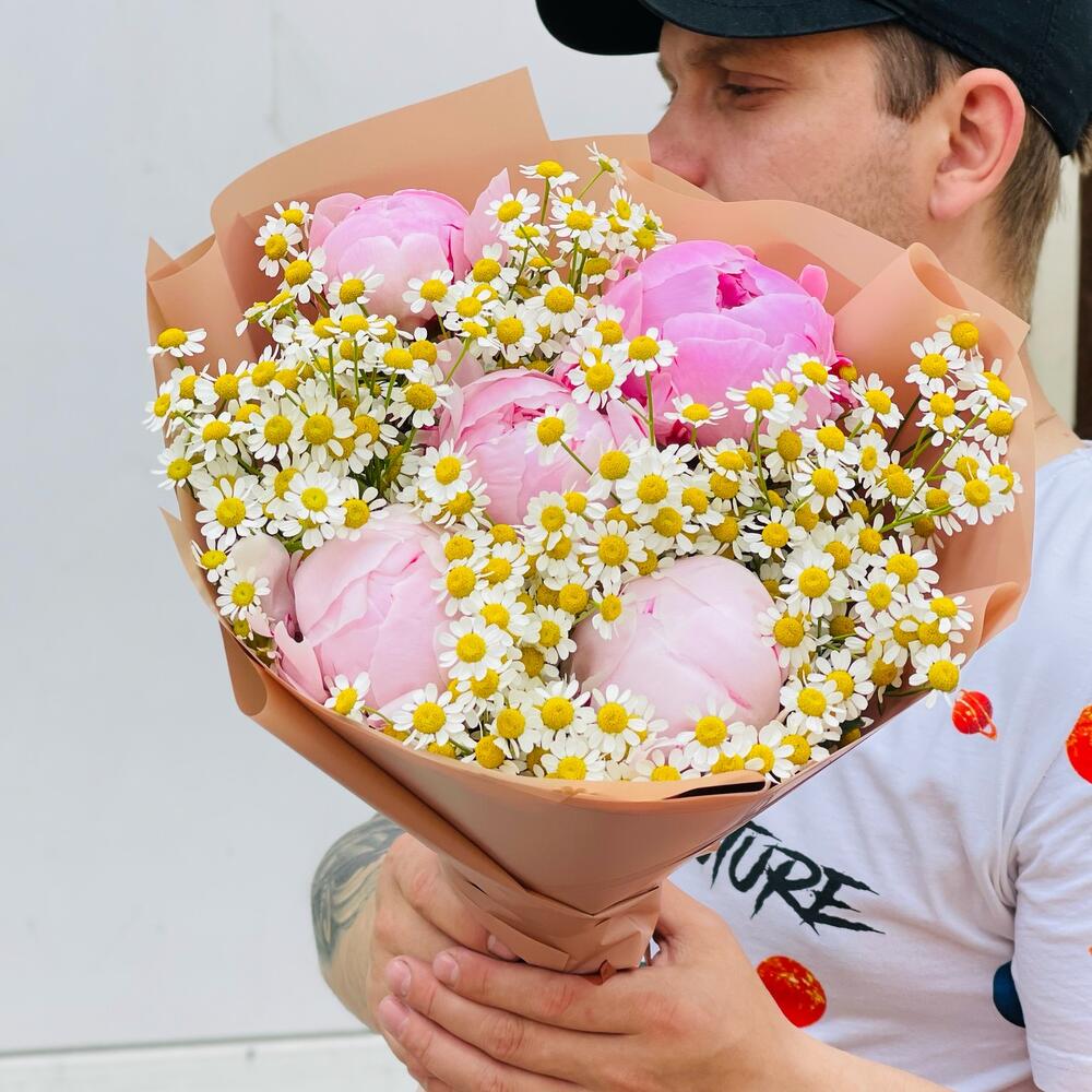 Лента атласная – 1 шт.Ромашка кустовая – 6 шт.Пион Сара Бернар – 5 шт.Упаковка дизайнерская – 3 шт.