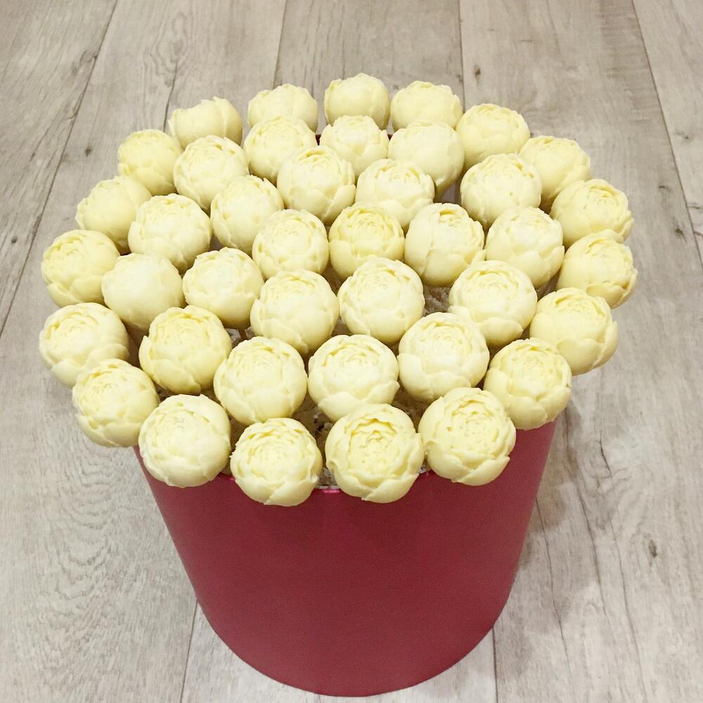 пионы из бельгийского белого шоколада – 41 шт.Шпажки – 41 шт.Упаковка – 1 шт.Атласная лента – 1 шт.Шляпная коробка – 1 шт.