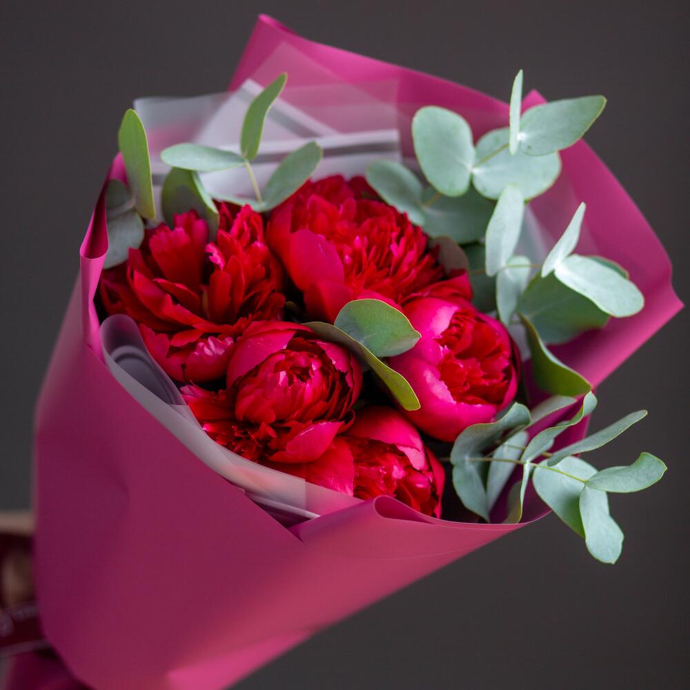 Букет из 5 бордовых пионов с эвкалиптом