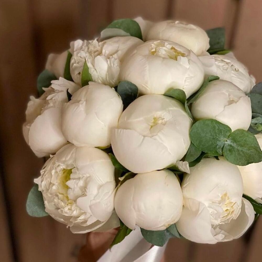 Пион белый – 13 шт.Упаковка дизайнерская – 1 шт.Лента атласная – 2 шт.Открыточка с вашими пожеланиями – 1 шт.хорошее настроение – 100 шт.инструкция по уходу за цветами – 1 шт.коробка переноска – 1 шт.Кризал – 1 шт.Эвкалипт – 10 шт.