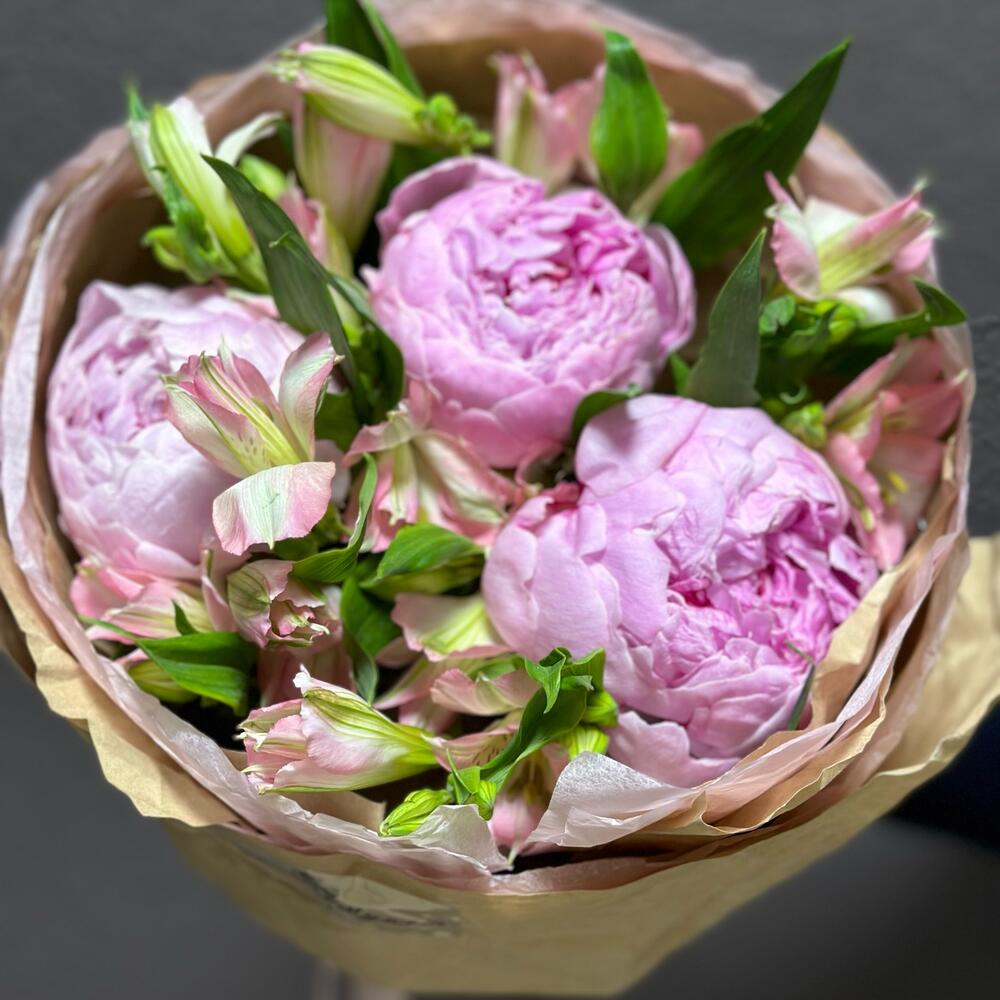 Альстромерия – 3 шт.Лента атласная – 1 шт.Тишью – 2 шт.Пион Сара Бернар – 3 шт.Крафт упаковка – 1 шт.