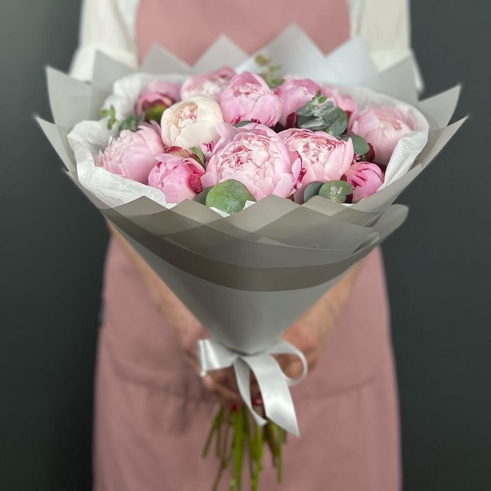 Пион – 15 шт.Эвкалипт – 7 шт.Лента атласная – 1 шт.Бумага тишью – 3 шт.бумага дизайнерская – 6 шт.