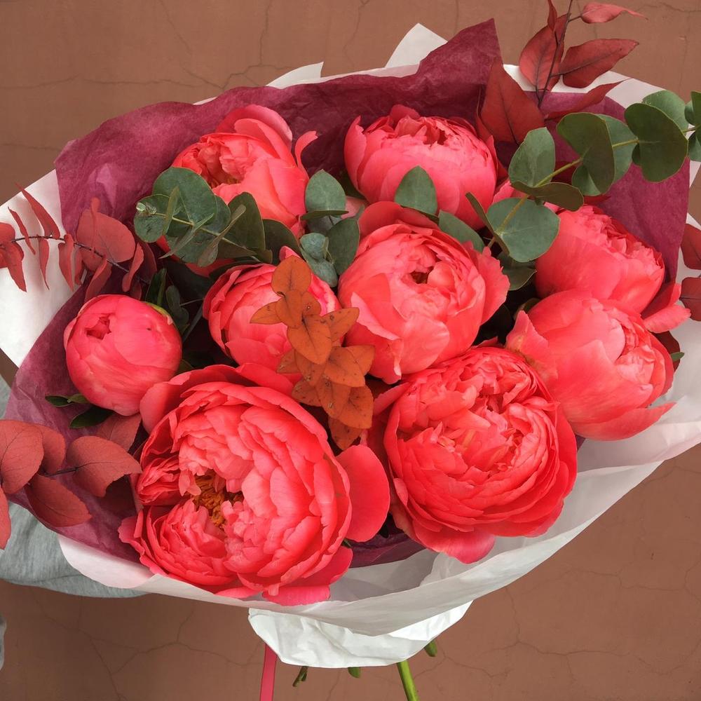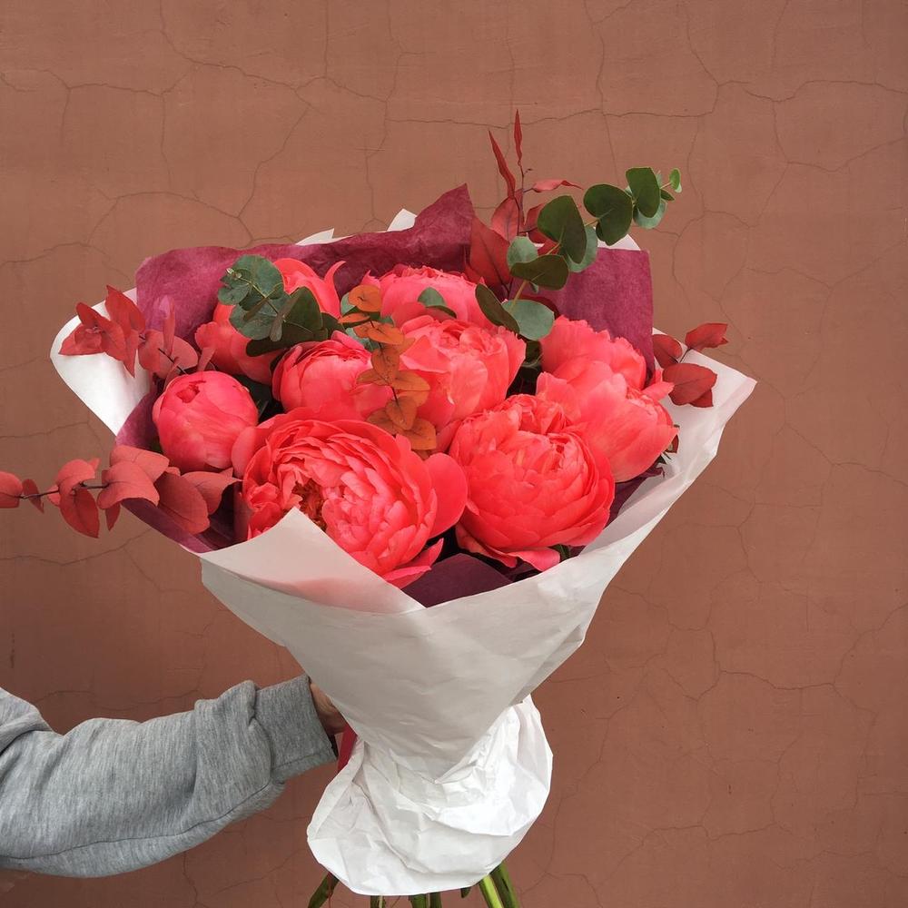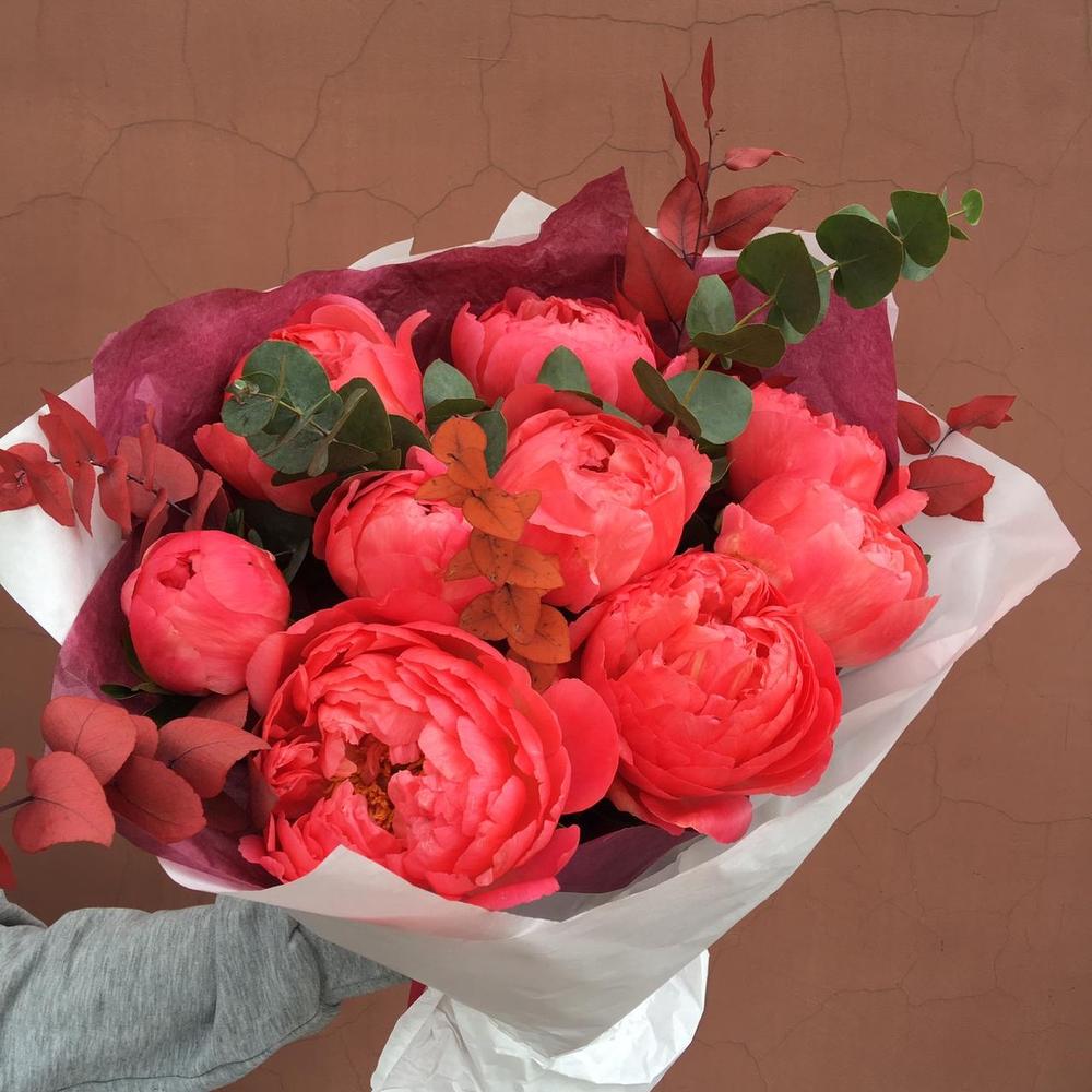 Пион – 9 шт.Эвкалипт – 3 шт.Лента атласная – 1 шт.Тишью – 2 шт.Упаковка крафт – 3 шт.