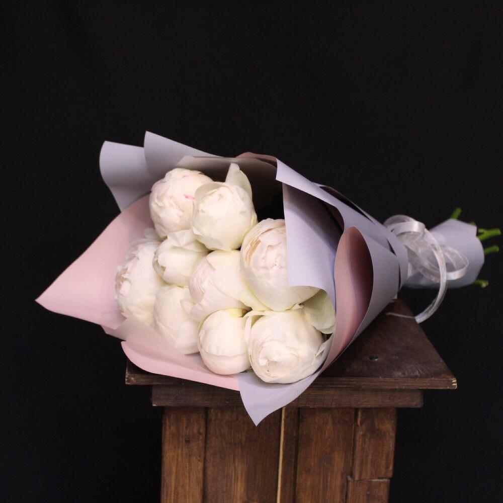 Лента атласная – 1 шт.Пион белый – 9 шт.Пленка дизайнерская – 4 шт.