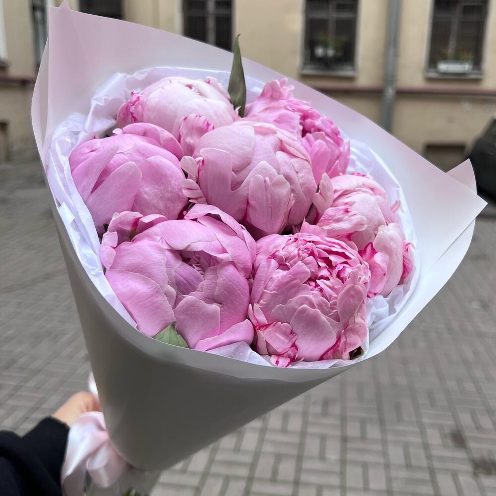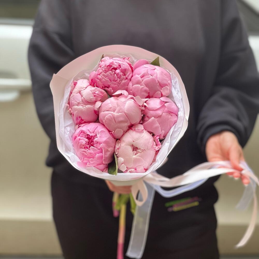 Упаковка – 2 шт.Лента атласная – 1 шт.Пион Сара Бернар розовый – 7 шт.