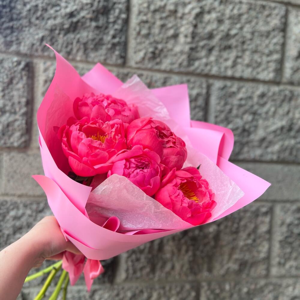 Пион – 5 шт.Лента атласная – 1 шт.Упаковка дизайнерская – 3 шт.