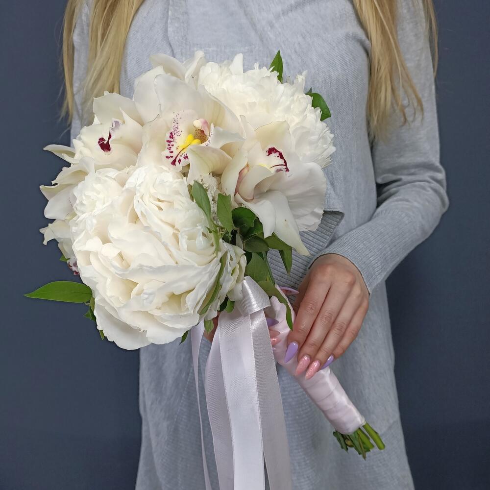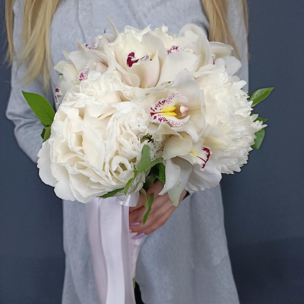 Свадебный букет с пионами и орхидеями