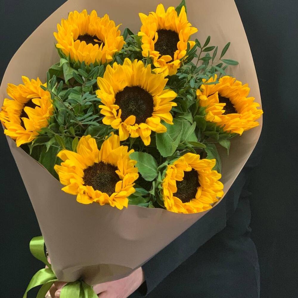 Подсолнух – 7 шт.Фисташка – 3 шт.Крафт – 1 шт.Лента атласная – 1 шт.