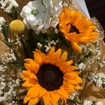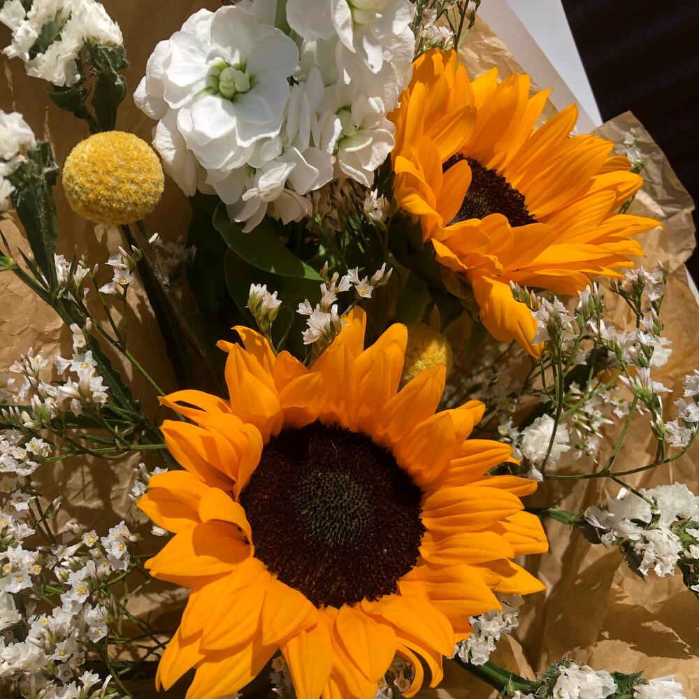 Краспедия – 2 шт.Лента – 1 шт.Лимониум – 1 шт.Статица – 2 шт.Тишью – 2 шт.Пленка матовая – 3 шт.маттиола белая ароматная – 1 шт.подсолнух гелиантус – 2 шт.