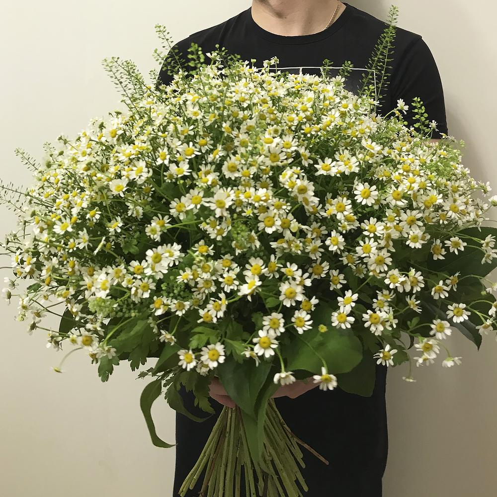 Ромашка полевая – 50 шт.Гринбелл – 10 шт.Салал – 10 шт.Лента атласная – 2 шт.