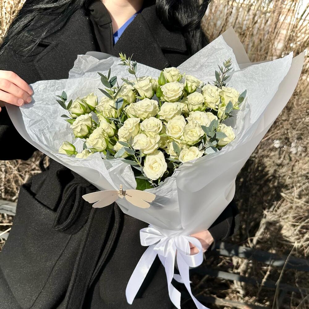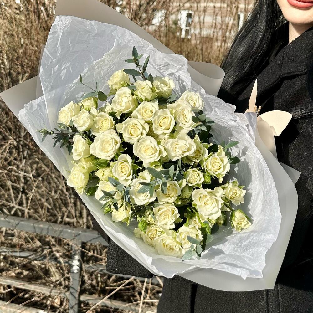 11 белых кустовых роз с эвкалиптом
