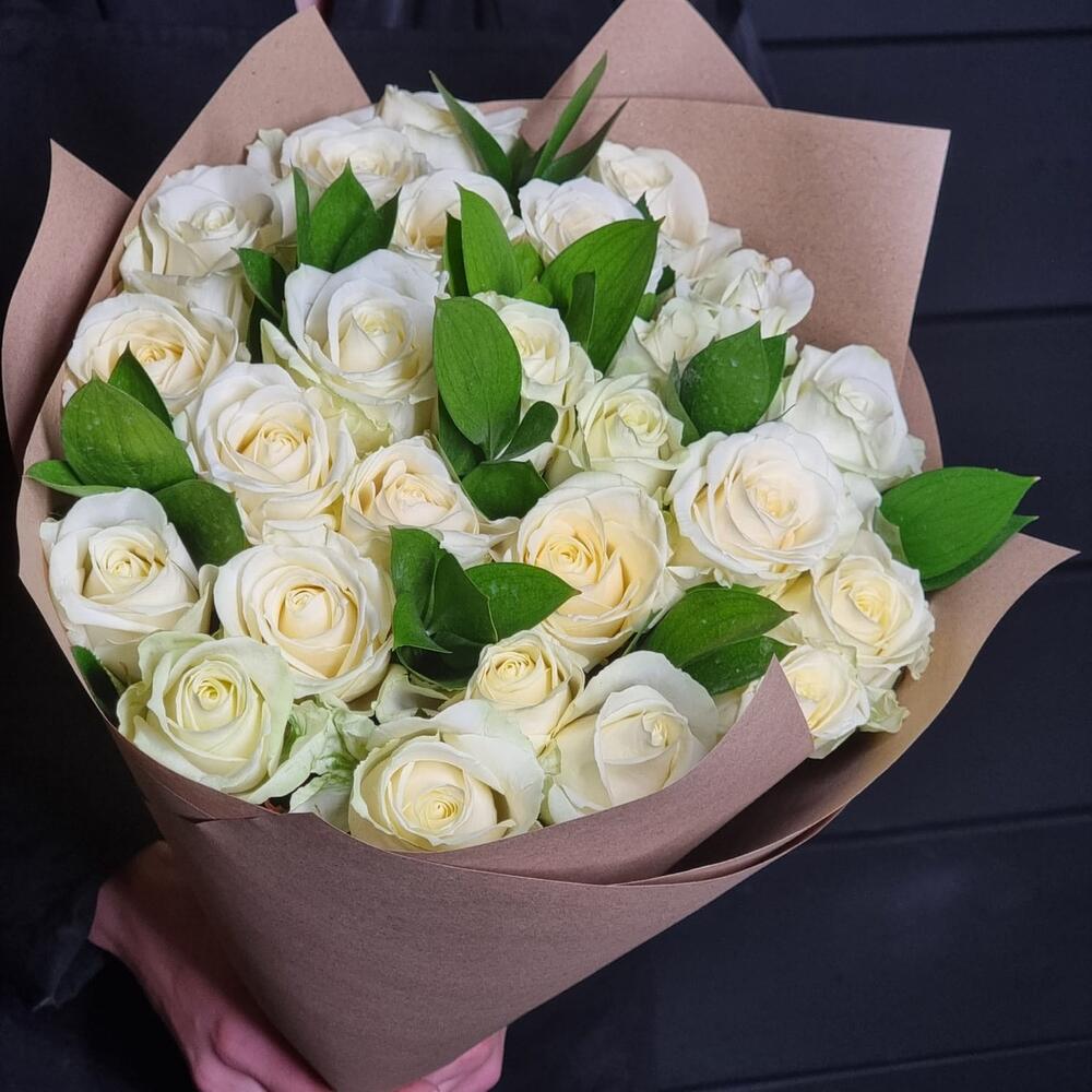 Роза 60 см – 25 шт.Зелень – 1 шт.Крафт упаковка – 1 шт.Лента атласная – 1 шт.