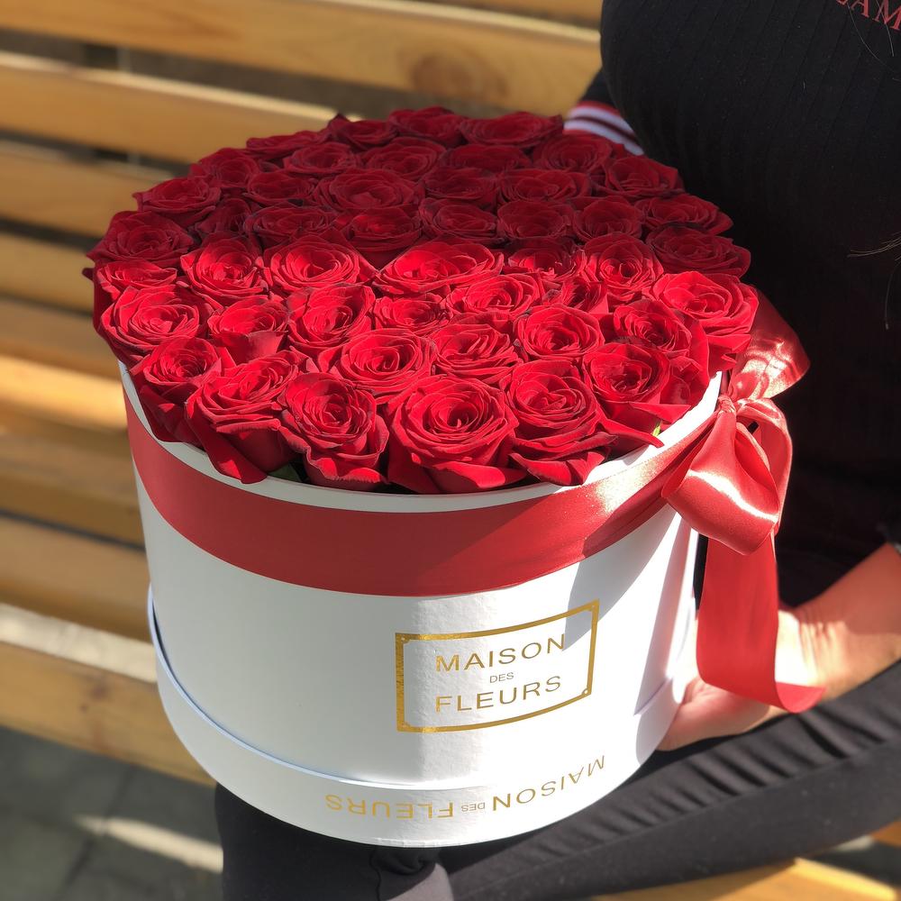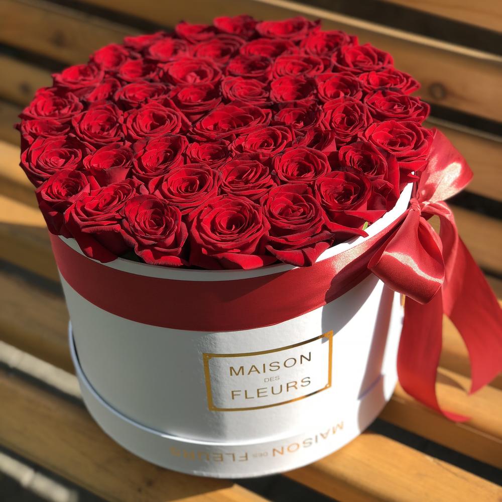 Прекрасная классическая композиция из Красных роз в белой фирменной Коробке, перевязанная шелковой лентой.