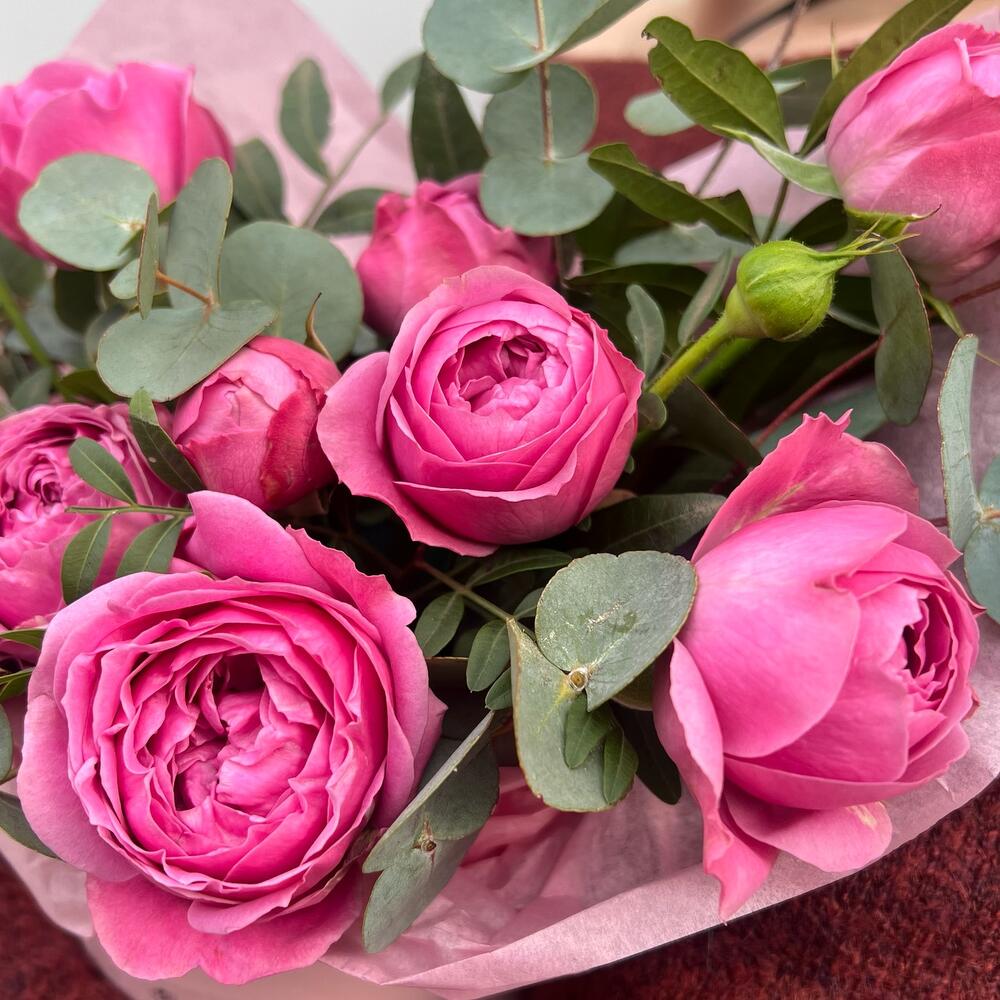 Эвкалипт – 1 шт.Тишью – 1 шт.Роза кустовая пионовидная – 3 шт.Оазис флористический – 1 шт.коробка шляпная 12х15 – 1 шт.