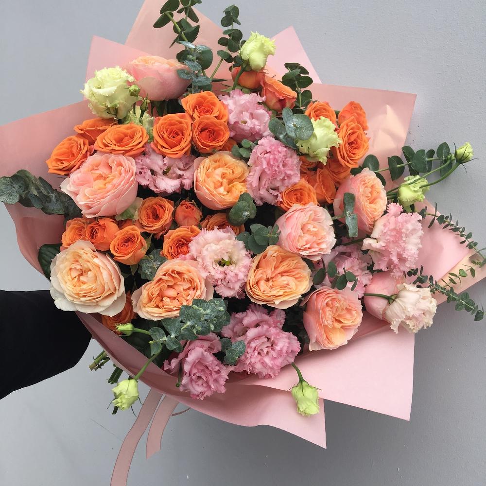 Роза пионовидная – 9 шт.Роза кустовая – 5 шт.Лизиантус – 9 шт.Эвкалипт – 9 шт.Упаковка – 3 шт.Лента атласная – 2 шт.